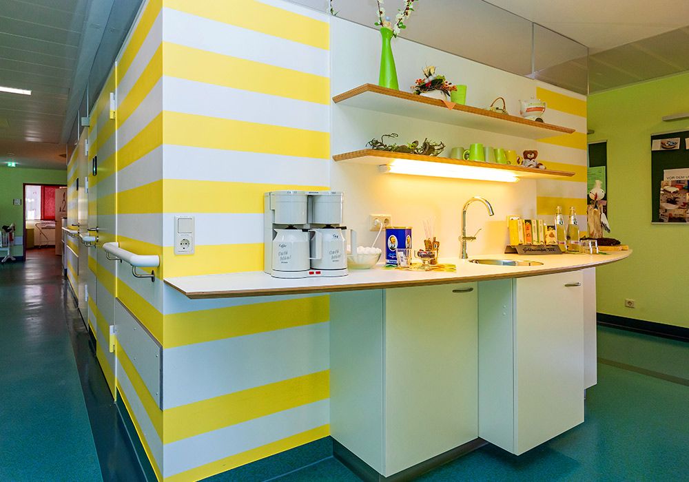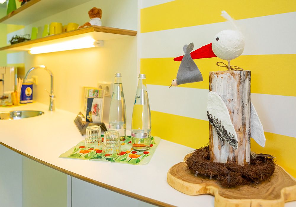 Für die kleine Auszeit zwischendurch haben wir außerhalb des Kreißsaals einen kleinen Bereich für den Partner geschaffen, damit auch er einmal durchatmen und sich von der Anstrengung bei einer stärkenden Tasse Kaffee erholen kann.